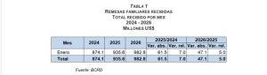 En el primer mes de 2026, se recibieron US$982.8 millones, superando en 5.0 % al monto recibido en enero del año pasado