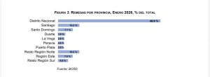 Respecto a la distribución de las remesas recibidas por provincias, el BCRD señala que el Distrito Nacional recibió una proporción del 48.9 % durante enero, seguido por las provincias de Santiago y Santo Domingo, con un 10.2 % y 7.1 %, respectivamente. Esto indica que unas dos terceras partes de las remesas (66.2 %) se reciben en las zonas metropolitanas del país.